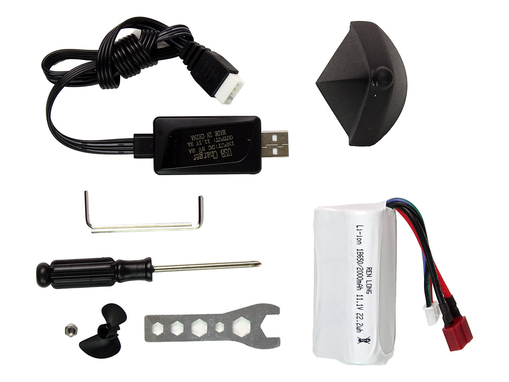 Zestaw zawiera także dodatki takie jak: kabel do akumulatora, klucz, śrubokręt, podstawkę pod motorówkę, która zapewni jej stabilność na lądzie, śrubę oraz dwa klucze sześciokątne.