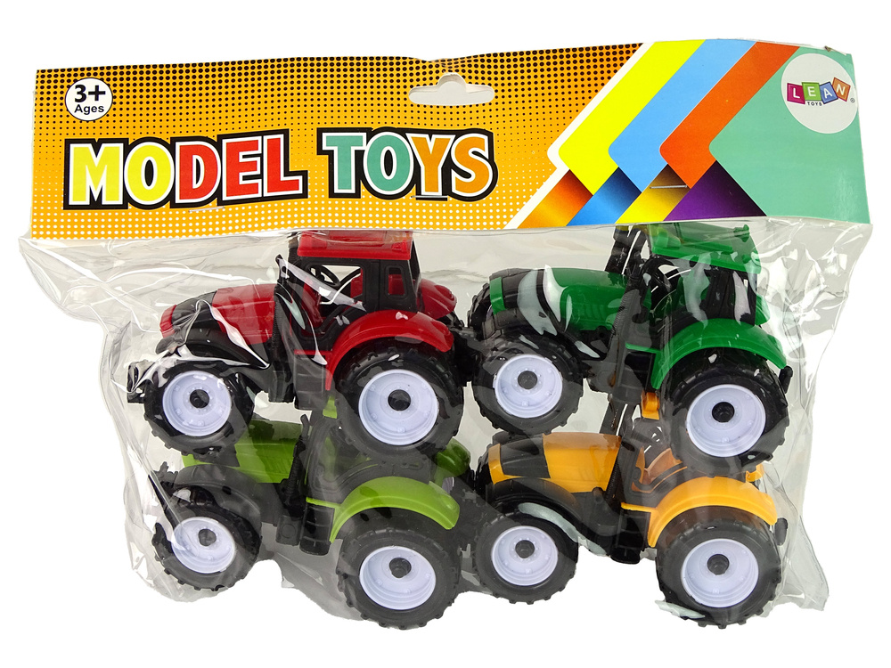 W zestawie znajdują się traktory w 4 kolorach: ciemny zielony, jasny zielony, pomarańczowy i czerwony, co wprowadza różnorodność do zabawy.