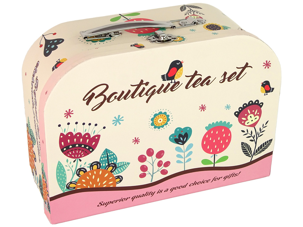 W środku kuferka znajduje się zestaw do kawy i herbaty, który składa się z małych i dużych talerzyków, czajnika do parzenia, filiżanek oraz tacki. Wszystkie elementy zestawu są w utrzymane w uroczej, różowej kolorystyce i mają ciekawe wzory, które przyciągają uwagę.