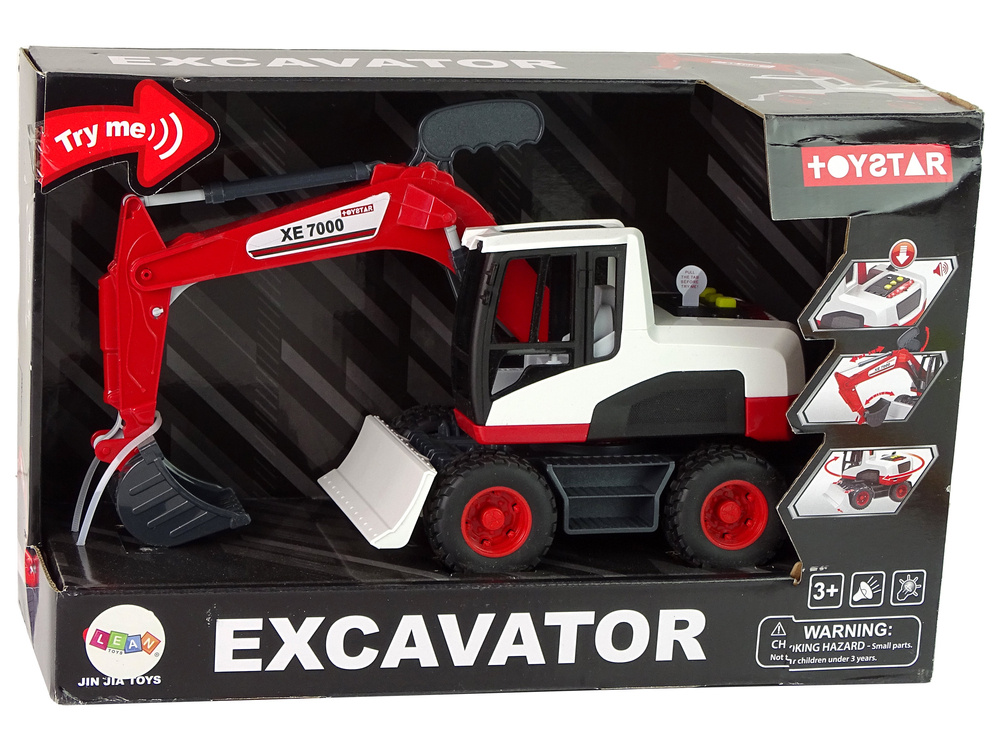 Koparka jest w kolorze czerwono-białym. Posiada łyżkę, którą można ruszać poprzez użycie odstającego uchwytu. Dodatkowo koparka posiada trzy różne dźwięki charakterystyczne dla tego pojazdu. Dźwięki pojawiają się, gdy naciśniemy żółte przyciski. Naciśnięcie przycisków spowoduje również włączenie się czerwonego światła widniejącego przy przyciskach. Koparka posiada również możliwość przekręcania się w prawo i w lewo kabiny, która zapewni Twojemu dziecku jeszcze większą frajdę. Twoje dziecko pozna świat charakterystycznych aut.