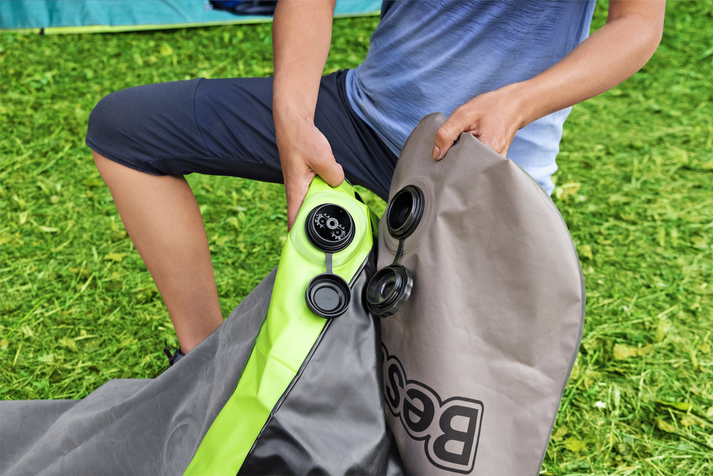 Materac turystyczny przeznaczony jest do użytku zarówno wewnętrznego jak i zewnętrznego. Został wykonany z wytrzymałego materiału PVC, dzięki czemu jest odporny na uszkodzenia. W swojej górnej części pokryty jest miękkim welurem. Materac dopasowuje się do ciała i idealnie sprawdzi się pod namiotem lub w domu jako zapasowe łóżko dla gości.Klasyczny materac nadmuchiwany ma strukturę zwojową, zaprojektowaną tak, aby naśladować sprężyny w typowym materacu. Zastosowany materiał i ma solidną konstrukcję, która zapewnia długotrwałą żywotność podczas wygodnych wycieczek kempingowych i przygód na świeżym powietrzu. Gdy będziesz gotowy do napompowania materaca, po prostu wyciągnij materac i podłącz torbę do zaworu. Otwórz torbę i obracaj nią w górę i w dół, w celu złapania powietrza. Zwiń otwarty koniec torby, aby uwięzić powietrze w środku. Ściśnij torbę, aby wypchnąć powietrze wewnątrz materaca. Powtarzaj aż do osiągnięcia pożądanej twardości materaca.Materac można łatwo schować z powrotem do torby transportowej i z łatwością transportować.