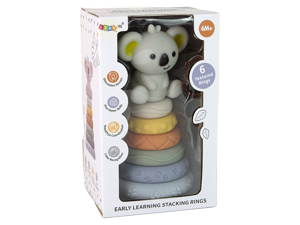Na szczycie piramidy znajduje się urocza koala, który wzbudza zainteresowanie i zachęca do zabawy. Dzieci będą cieszyć się, próbując obracać i układać krążki w różnych konfiguracjach, co rozwija ich zdolności motoryczne, koordynację ręka-oko i umiejętności logicznego myślenia.