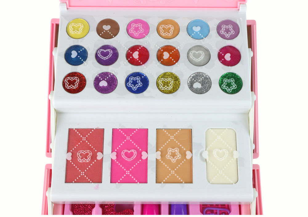 Dla pełnego komfortu podczas aplikacji makijażu, zestaw zawiera praktyczne narzędzia, takie jak 3 różowe pędzelki do cieni, pacynkę do makijażu oraz szczoteczkę do brwi. W zestawie znajdują się również niezbędne do zdobień paznokci: różowy, brokatowy separator kosmetyczny oraz pilniczek do paznokci. Zawieszki do paznokci 3D znajdujące się w kuferku, umożliwiają wyjątkowe, spersonalizowane zdobienia.