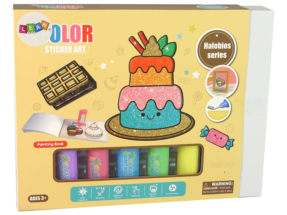 Zestaw zawiera różnorodne naklejki, które przypominają przepyszne torty, makaroniki, czekolady. Twoje dziecko będzie miało możliwość pomalować produkt według własnej wyobraźni. Naklejka ma tylko obramowanie, wypełnienie zależy od Ciebie. Dołączone do zestawu 8 kolorów i brokat sprawią, że naklejki na szybie będą błyszczeć i mienić się.