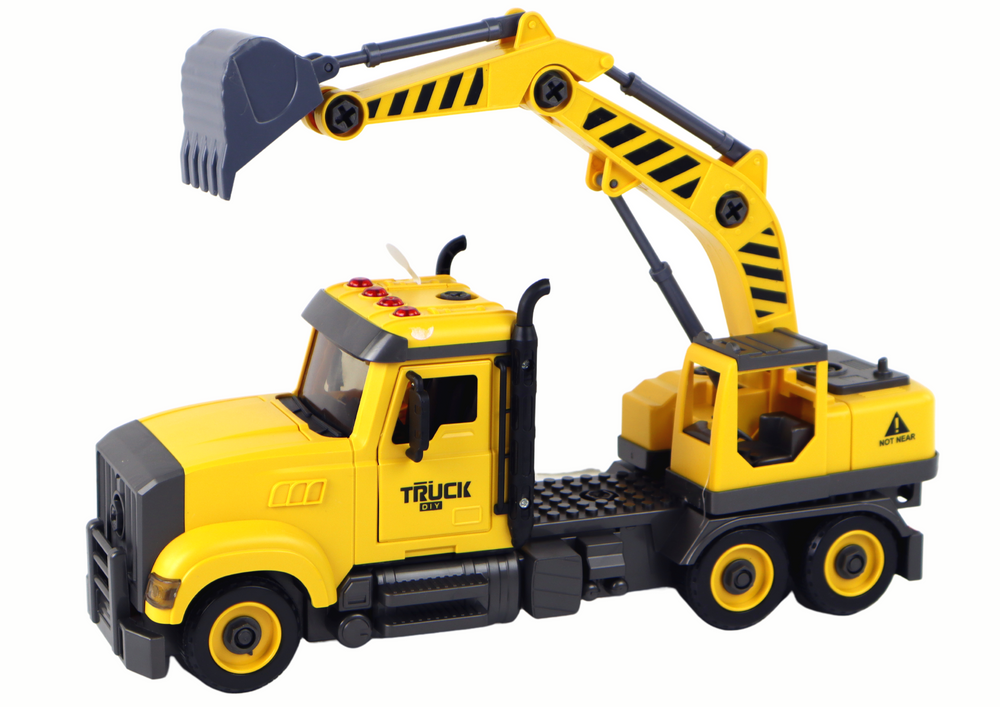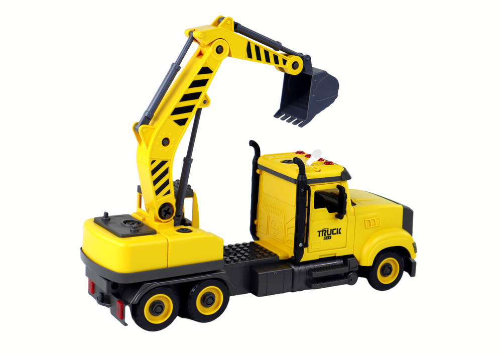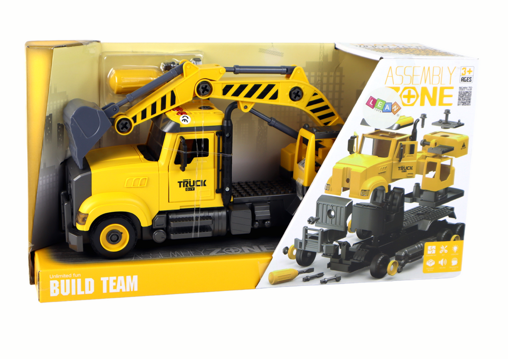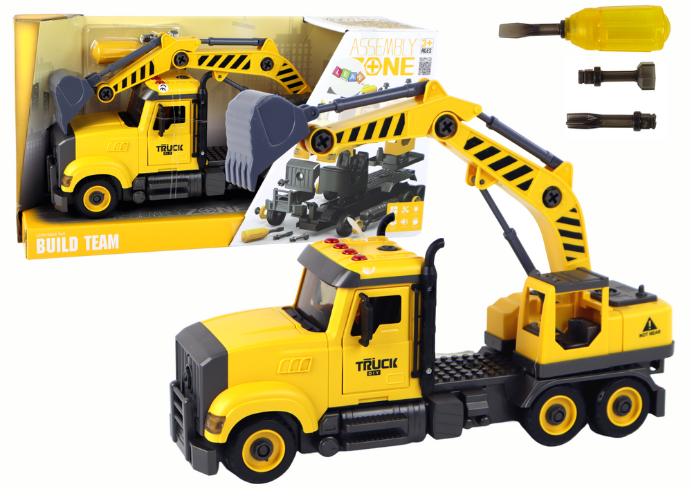 Zestaw zawiera żółtą ciężarówkę z dźwigiem o wymiarach 38 cm x 16 cm x 8,5 cm. Znajdziesz w niej 4 guziki, które aktywują 4 różne dźwięki, dodając autentyczności do zabawy ( 3 x 1.5V w zestawie). Ruchome elementy, takie jak drzwi i ruchomy dźwig, dodają dodatkowej atrakcji i zachęcają do eksploracji.