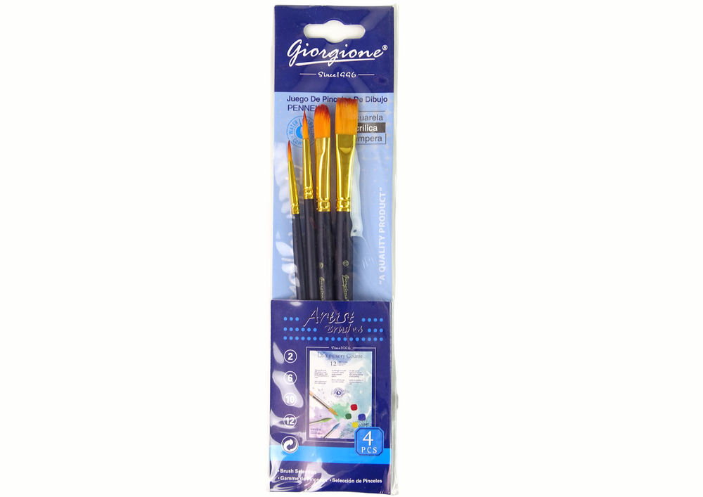 - Niezastąpiony zestaw 4 pędzli do malowania. Miękkie włosie, ergonomiczne drewniane rączki. Różnorodność kształtów i długości włosia. Idealny dla artystów. Praktyczny i kompaktowy - wymiary opakowania: 25 cm x 6 cm x 1 cm.