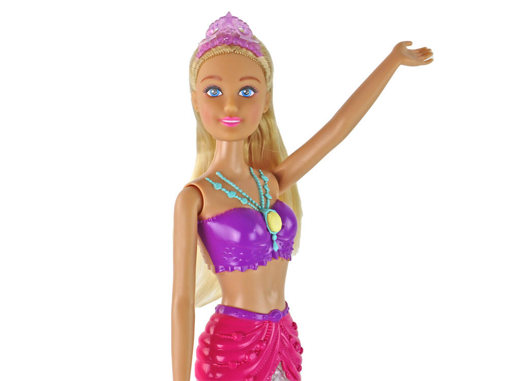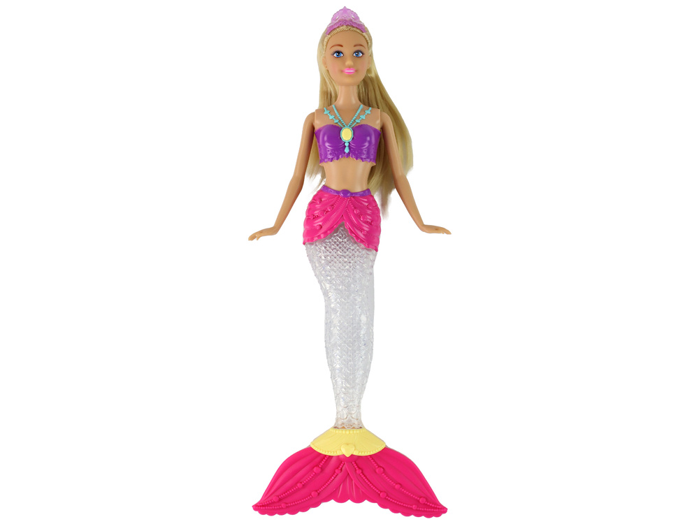 Nasza Lalka Syrenka z długimi, pięknymi blond włosami, koroną na głowie i przepięknym różowo-fioletowym strojem, ta lalka emanuje elegancją i urokiem. Jej przeźroczysty ogon to prawdziwa niespodzianka. Po wciśnięciu guziczka ogon zmienia się w kolorowy efekt świetlny, tworząc magiczną atmosferę pod wodą.