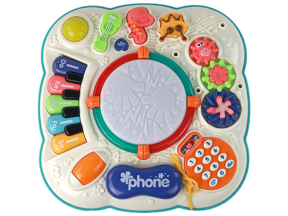 W centralnej części pianinka znajduje się bębenek, który reaguje zarówno dźwiękowo, jak i świetlnie na interakcje dziecka. To zapewnia nie tylko atrakcyjną zabawę, ale także rozwijanie zmysłów, jak słuch i wzrok.