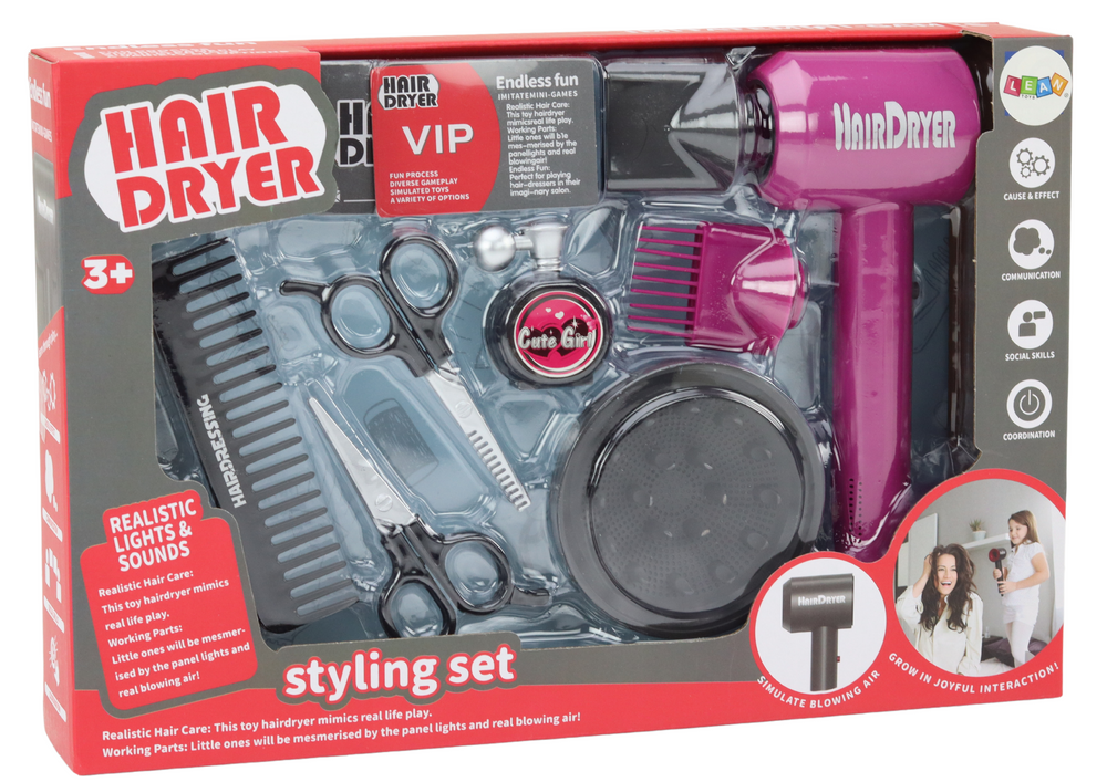 Centralnym elementem zestawu jest suszarka do włosów w kolorze różowym, która dodaje uroku i atrakcyjności zabawce. Suszarka jest zasilana dwoma bateriami, co pozwala na realistyczne symulowanie suszenia włosów, gdyż wydaje z siebie podmuch powietrza. Dodatkowo, suszarka posiada trzy różne końcówki, które umożliwiają różnorodne style suszenia włosów, co dodaje elementu zmienności i kreacyjności zabawie.