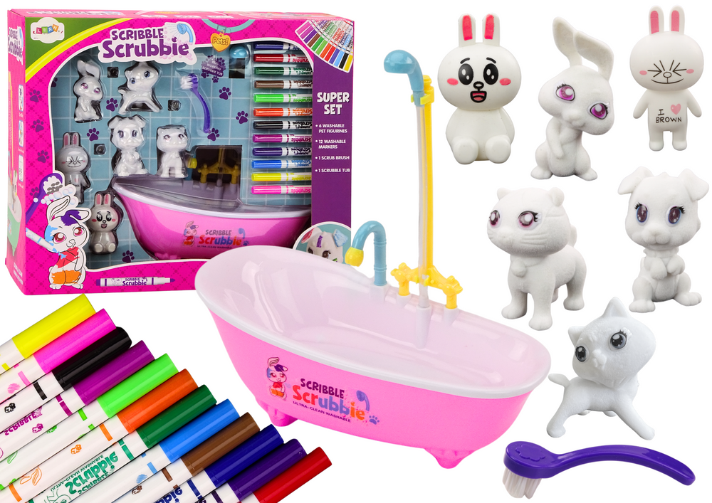 - Zestaw do malowania i zmywania zwierzaków to wyjątkowa zabawka. Sześć uroczych figurek zwierzątek, 12 specjalnych pisaków. Dodatkowo, zestaw zawiera wannę oraz szczotkę, co umożliwia zmywanie farby z figurek i malowanie ich na nowo,