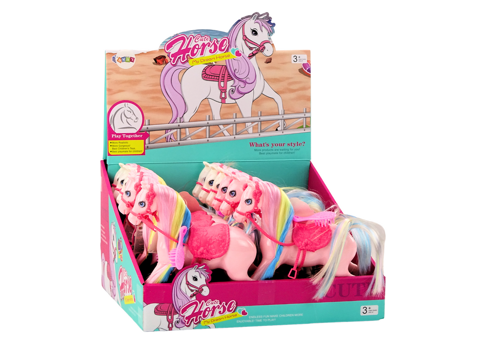 - Uroczy koń z grzywą mieniącą się kolorami, różowym siodłem i szczotką do pielęgnacji. Wymiary: 20x19x5 cm. Idealny prezent dla każdego małego miłośnika koni!