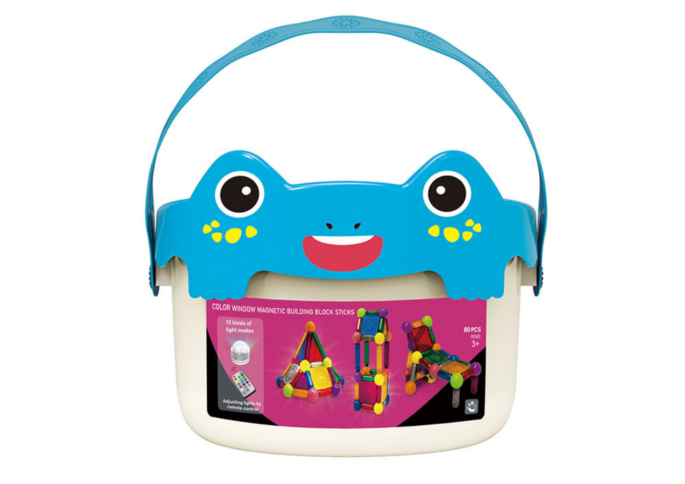 - Zestaw 80 klocków magnetycznych w uroczym wiaderku z motywem żabki. Pozwala na łatwe łączenie w różne figury dzięki magnetycznym połączeniom. Dodatkowo, lampka podświetlająca budowle sterowana pilotem dodaje atrakcyjności.