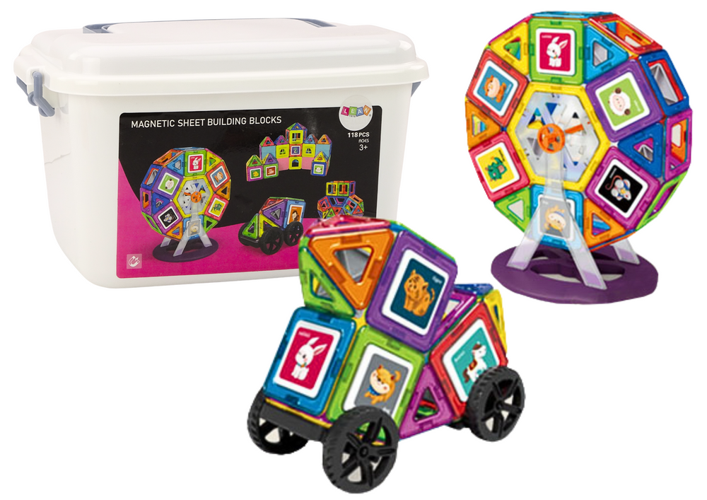 - Zestaw klocków magnetycznych oferuje 118 elementów w różnych kształtach. Można z nich zbudować koło młyńskie, autka i budynki. Zestaw jest przechowywany w wygodnej walizce z rączką, idealnej do transportu i przechowywania.