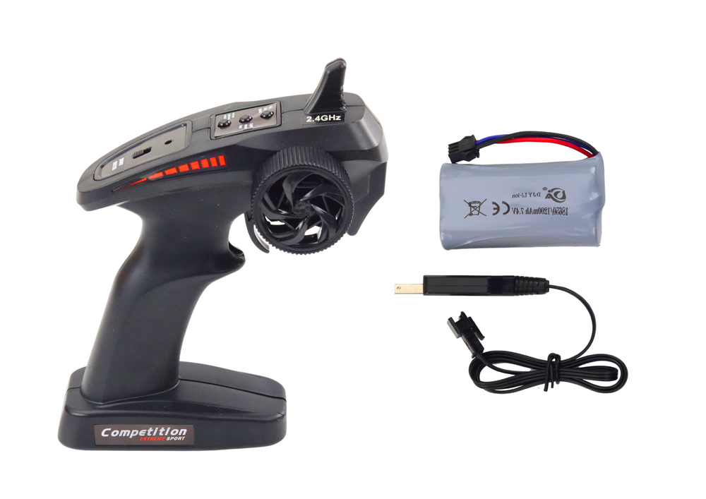 Sterowanie samochodem odbywa się za pomocą zaawansowanego pilota 2.4 G, który zapewnia pełen zakres ruchów i precyzyjną kontrolę nad pojazdem. Dzięki temu użytkownik może łatwo manewrować samochodem, wykonując ruchy, takie jak skręty, cofanie czy przyspieszanie. Pilot 2.4 G gwarantuje stabilne połączenie i szybkie reakcje, co jest kluczowe podczas intensywnych wyścigów i zabaw.