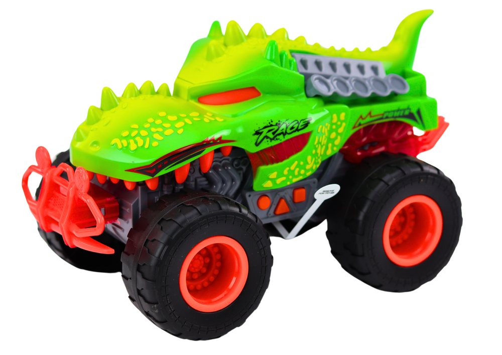 - Auto terenowe w kształcie zielonego dinozaura, wykonane z solidnych materiałów i starannie pomalowane. Posiada efekty świetlne i dźwiękowe. Dzięki napędowi, po pchnięciu rusza do przodu, zapewniając dynamiczną i interaktywną zabawę.