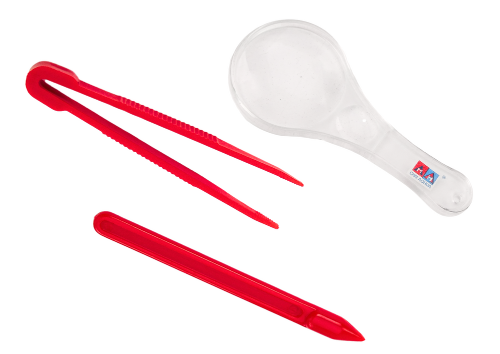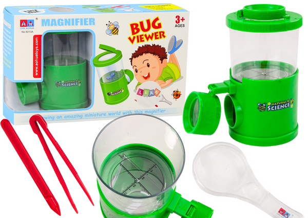 Wysokiej jakości lupa, która umożliwia dokładne oglądanie detali owadów i innych małych stworzeń. Praktyczny pojemnik wyposażony w szkło powiększające wbudowane w przykrywkę, co pozwala na wygodne obserwacje bez konieczności wyciągania owadów z pojemnika. Specjalny patyczek z chwytakiem, który umożliwia delikatne łapanie i przenoszenie owadów do pojemnika, bez ryzyka ich uszkodzenia. Pojemnik posiada ruchome drzwi, które zapewniają łatwy dostęp do jego wnętrza i pozwalają na szybkie wypuszczenie złapanych owadów z powrotem na wolność. Zestaw jest idealny do obserwacji ulubionych małych stworzeń.