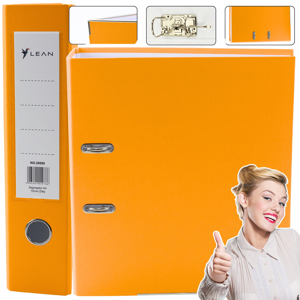 Segregator na dokumenty A4 z szerokim grzbietem 75 mm w eleganckim, intensywnym żółtym kolorze. Idealny do przechowywania dokumentów w biurze, domu oraz do organizacji materiałów szkolnych. Ten pojemny segregator mieści do 500 kartek (o gramaturze 80g/m²), co czyni go świetnym rozwiązaniem do archiwizacji faktur, umów, raportów i innych istotnych dokumentów. Wysoka jakość wykonania sprawia, że segregator jest niezawodny i trwały.
