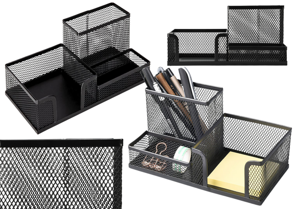 - Czarny metalowy organizer na biurko to stylowe i praktyczne rozwiązanie. Z trzema przestronnymi komorami, w tym dedykowanym miejscem na karteczki samoprzylepne, zapewnia łatwy dostęp do przyborów biurowych. Kompaktowy i elegancki, idealny do każdego biura