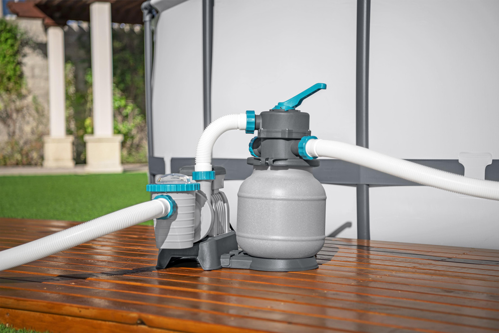- Pompa Piaskowa Bestway 58497 o wydajności 5678 L/h. Ekologiczna dzięki piaskowi kwarcowemu, silnik 500W. 6 trybów pracy, dozownik chemii dla czystości basenu.
