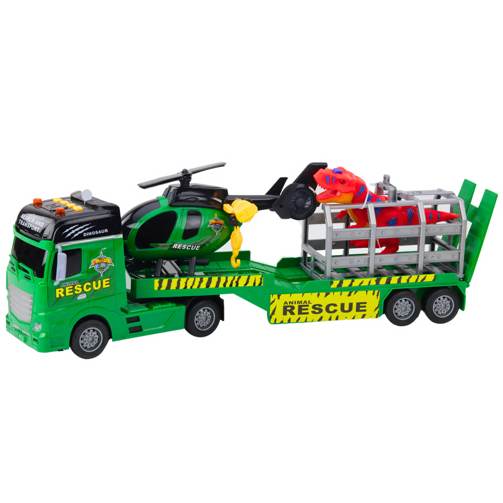 W komplecie znajduje się zielona ciężarówka z naczepą, helikopter ratunkowy z ruchomym hakiem oraz specjalna klatka transportowa z groźnie wyglądającym, czerwonym dinozaurem, który czeka na bezpieczne przetransportowanie. Całość została wykonana z solidnych, bezpiecznych materiałów, a każdy element zachwyca szczegółowością i estetyką wykonania.