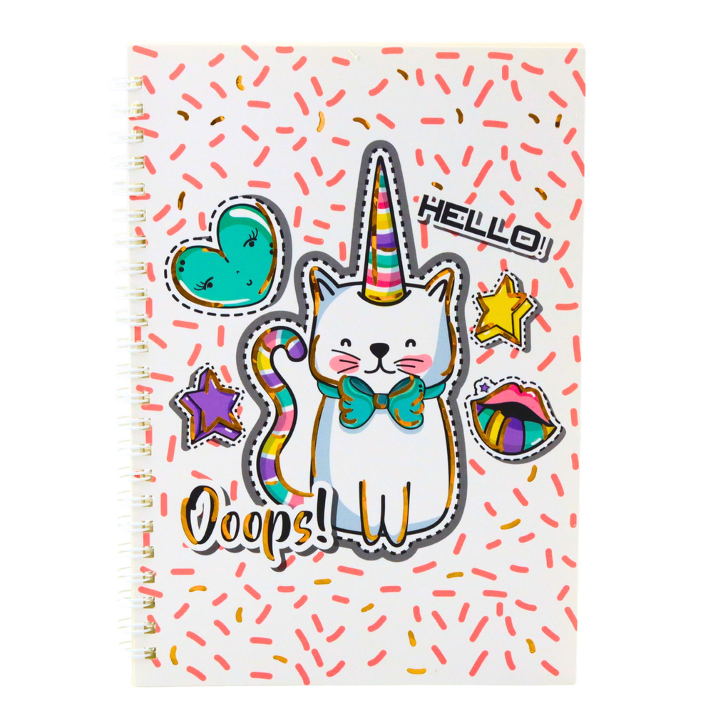 Notatnik z motywem kota jednorożca to doskonała propozycja dla dzieci i młodzieży, które kochają wesołe, bajkowe wzory. Okładka utrzymana w jasnej kolorystyce przyciąga uwagę detalami – białe tło pokryte różowymi kreskami stanowi tło dla sympatycznego kotka z tęczowym rogiem i ogonem, ubranego w turkusową kokardkę. Całość dopełniają ozdobne ilustracje serca, gwiazdek i napisów, które dodają zeszytowi jeszcze więcej uroku.