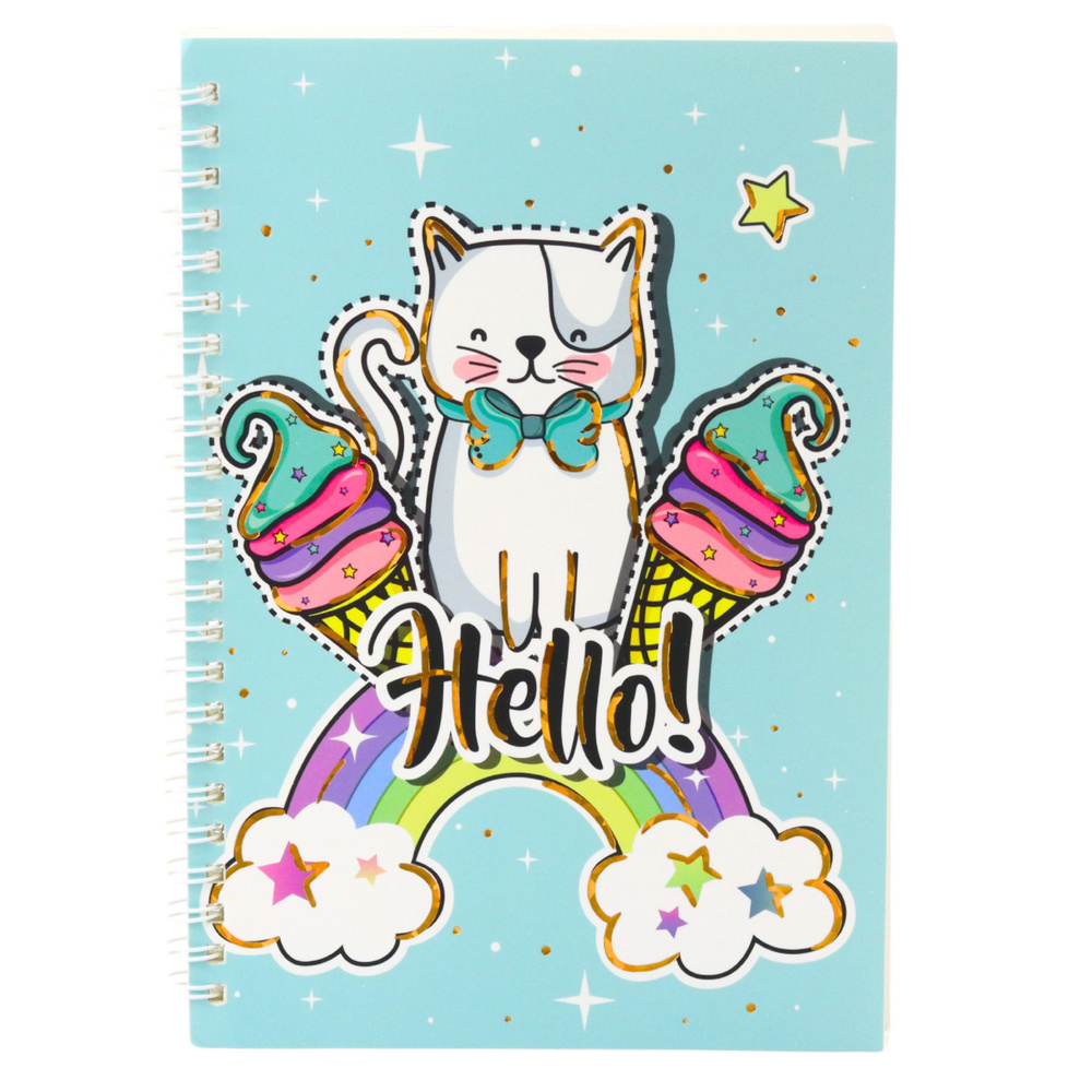 - Kolorowy i radosny notatnik z motywem bajkowego kota jednorożca to idealny wybór dla dzieci, które uwielbiają fantazyjne grafiki i pastelowe kolory. Na okładce pojawia się sympatyczny kotek z kokardką i rogiem jednorożca