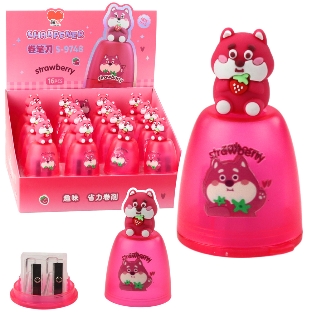 - Różowa funkcjonalna temperówka z motywem uroczego zwierzaka to doskonałe akcesorium do piórnika każdego dziecka. Strugaczka posiada dwa otwory, co pozwala na wygodne temperowanie zarówno cienkich, jak i grubych kredek.