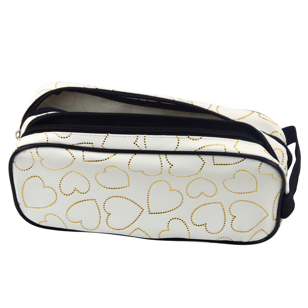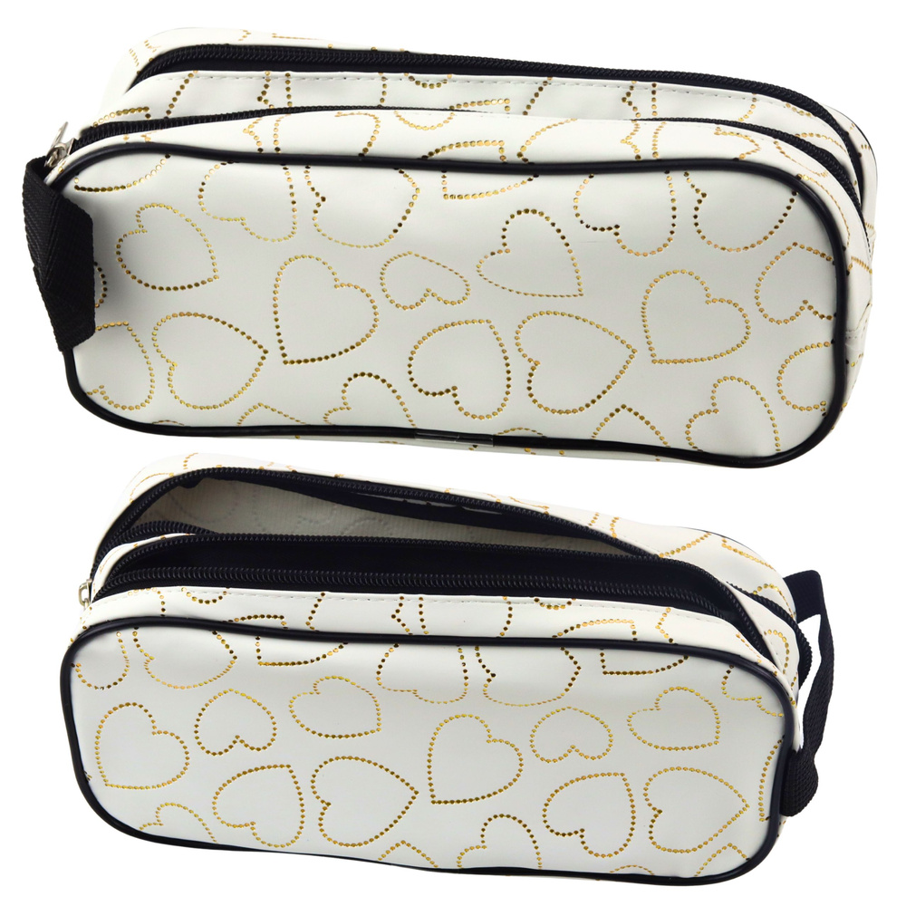 W całości wykonany z trwałego materiału tekstylnego z delikatnym połyskiem, wyróżnia się nadrukiem w postaci złotych serc na tle intensywnej bieli. Solidne zamki błyskawiczne gwarantują bezpieczne przechowywanie zawartości, a uchwyt boczny ułatwia przenoszenie. Elastyczna, miękka konstrukcja sprawia, że piórnik łatwo mieści się w plecaku lub torbie, nie zajmując przy tym zbyt wiele miejsca.