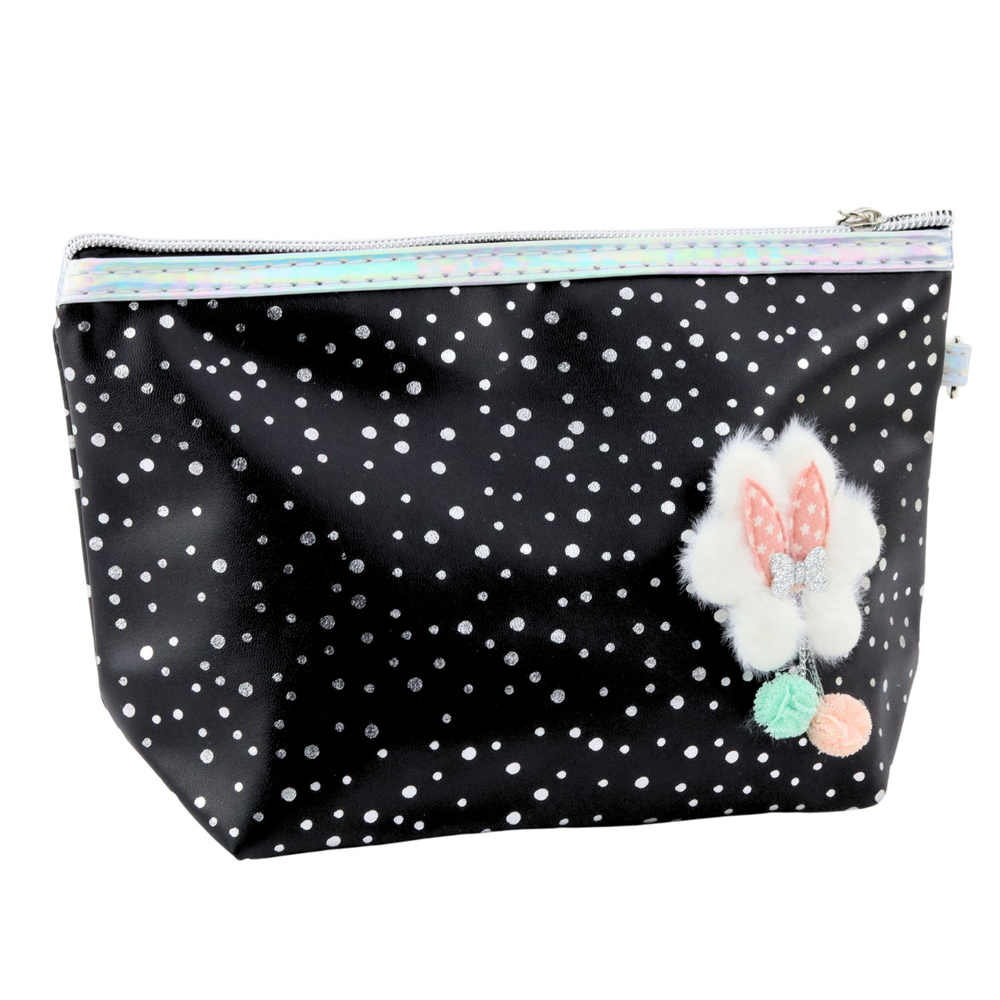Stylowy i funkcjonalny piórnik-kosmetyczka w kolorze czarnym z brokatowym wykończeniem to praktyczny dodatek zarówno do szkoły, jak i na co dzień. Dzięki uniwersalnej formie świetnie sprawdzi się jako piórnik na przybory szkolne lub kosmetyczka do przechowywania drobnych akcesoriów. Został wyposażony w solidny zamek błyskawiczny i poręczny uchwyt z karabińczykiem, który umożliwia wygodne przypięcie do plecaka lub noszenie na nadgarstku.
