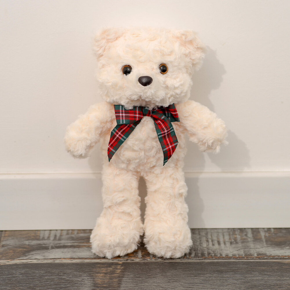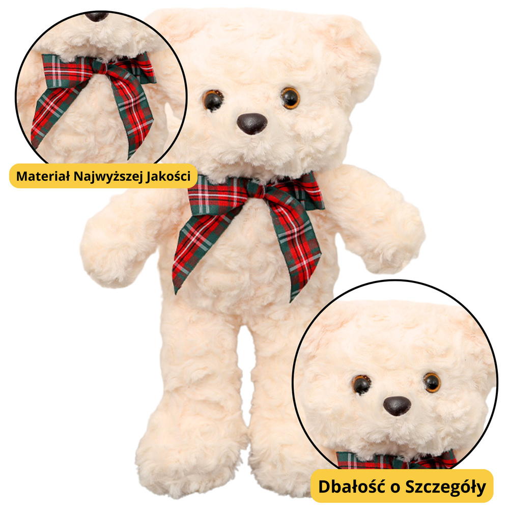 Ozdobna kokarda w klasyczną szkocką kratę stanowi elegancki akcent, który nadaje misiowi świątecznego i prezentowego charakteru. Miś ma stabilną, stojącą postawę i doskonale sprawdzi się jako towarzysz zabaw, przytulanka do snu czy element dekoracyjny w pokoju dziecka.
