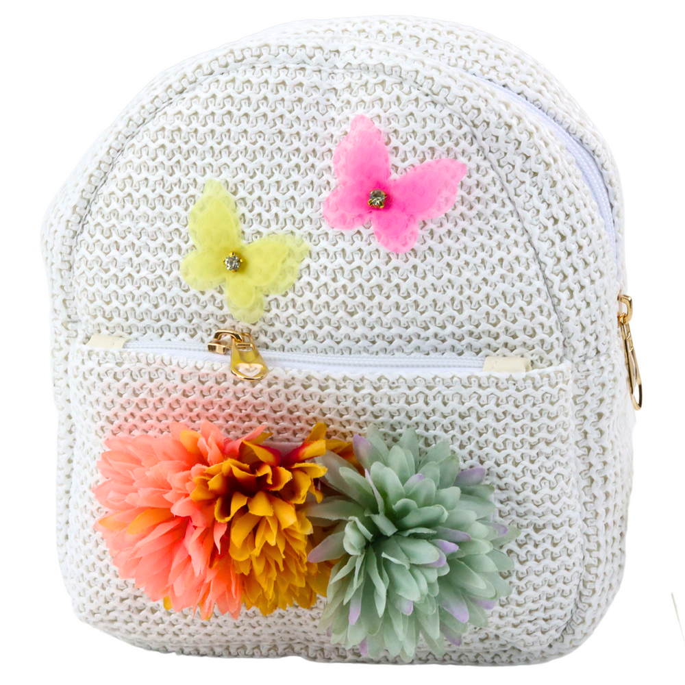 - Uroczy, mały plecak dziecięcy z haftowaną powierzchnią to idealny wybór dla najmłodszych. Delikatna faktura materiału w połączeniu z ozdobnymi aplikacjami w postaci kolorowych motylków i trójwymiarowych kwiatów.