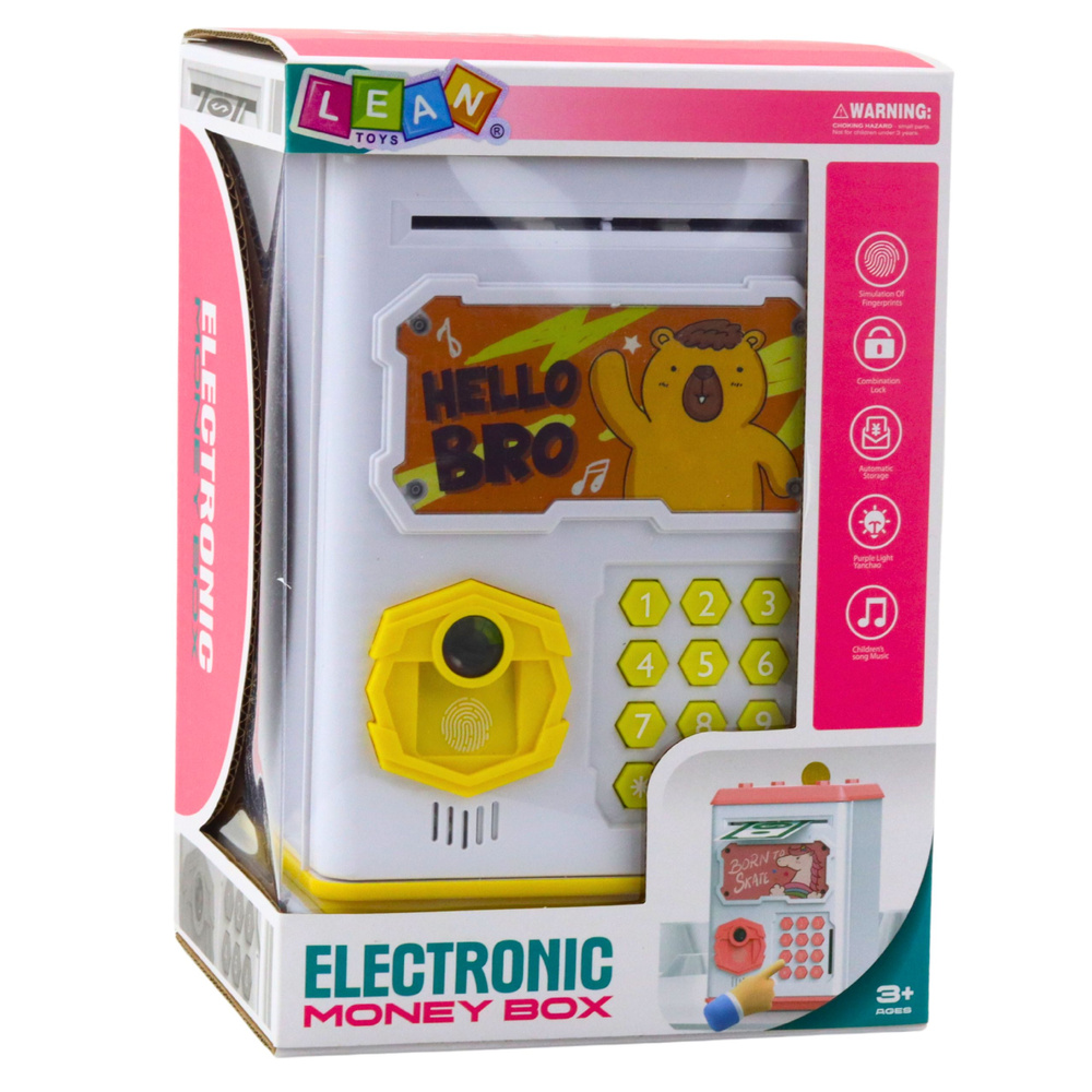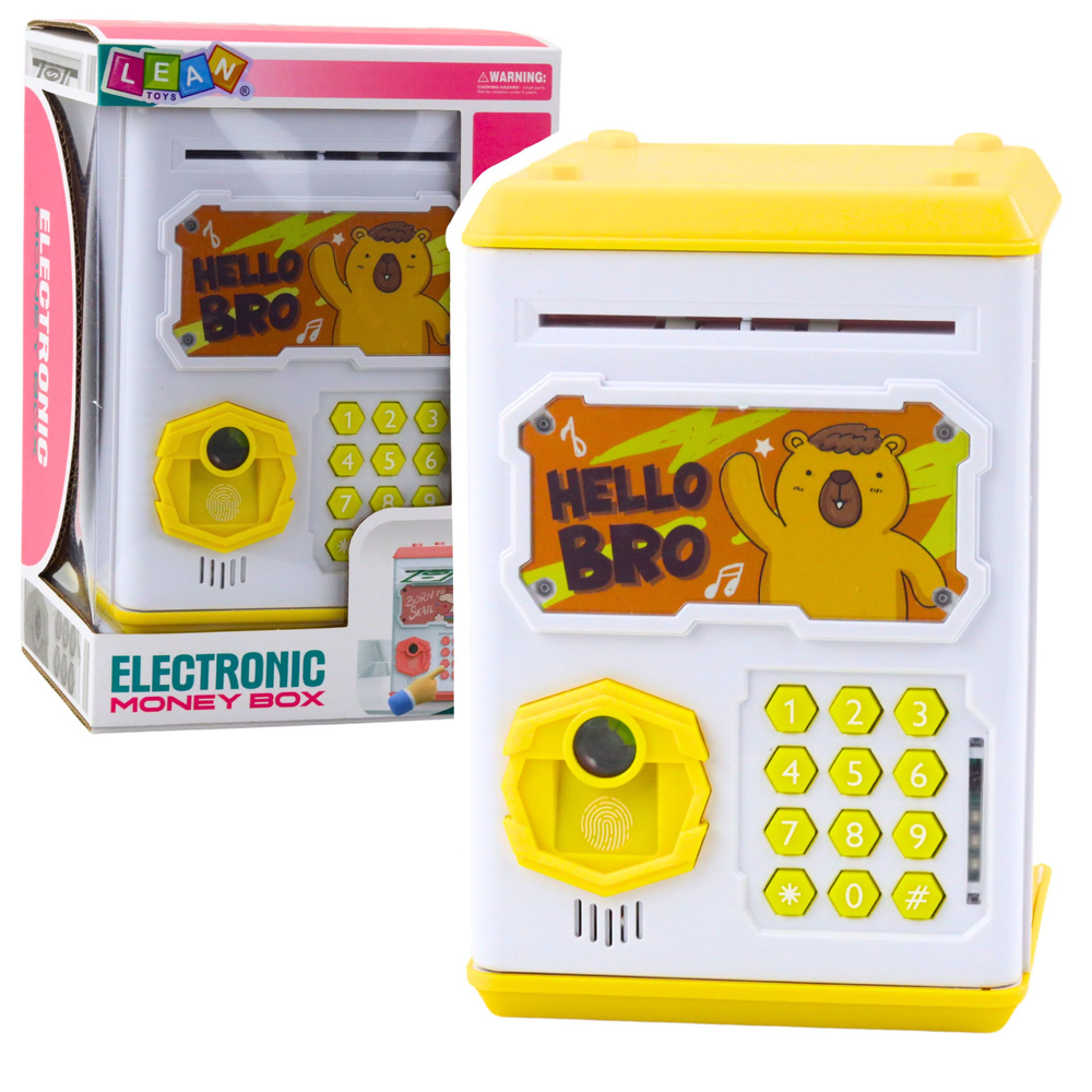 Elektroniczny sejf z motywem kapibary to funkcjonalna i edukacyjna zabawka, która wspiera naukę oszczędzania oraz uczy odpowiedzialności finansowej. Dzięki nowoczesnemu wyglądowi, żółtej kolorystyce i radosnej grafice „Hello Bro”, produkt przyciąga uwagę dziecka i zachęca do regularnego odkładania pieniędzy.