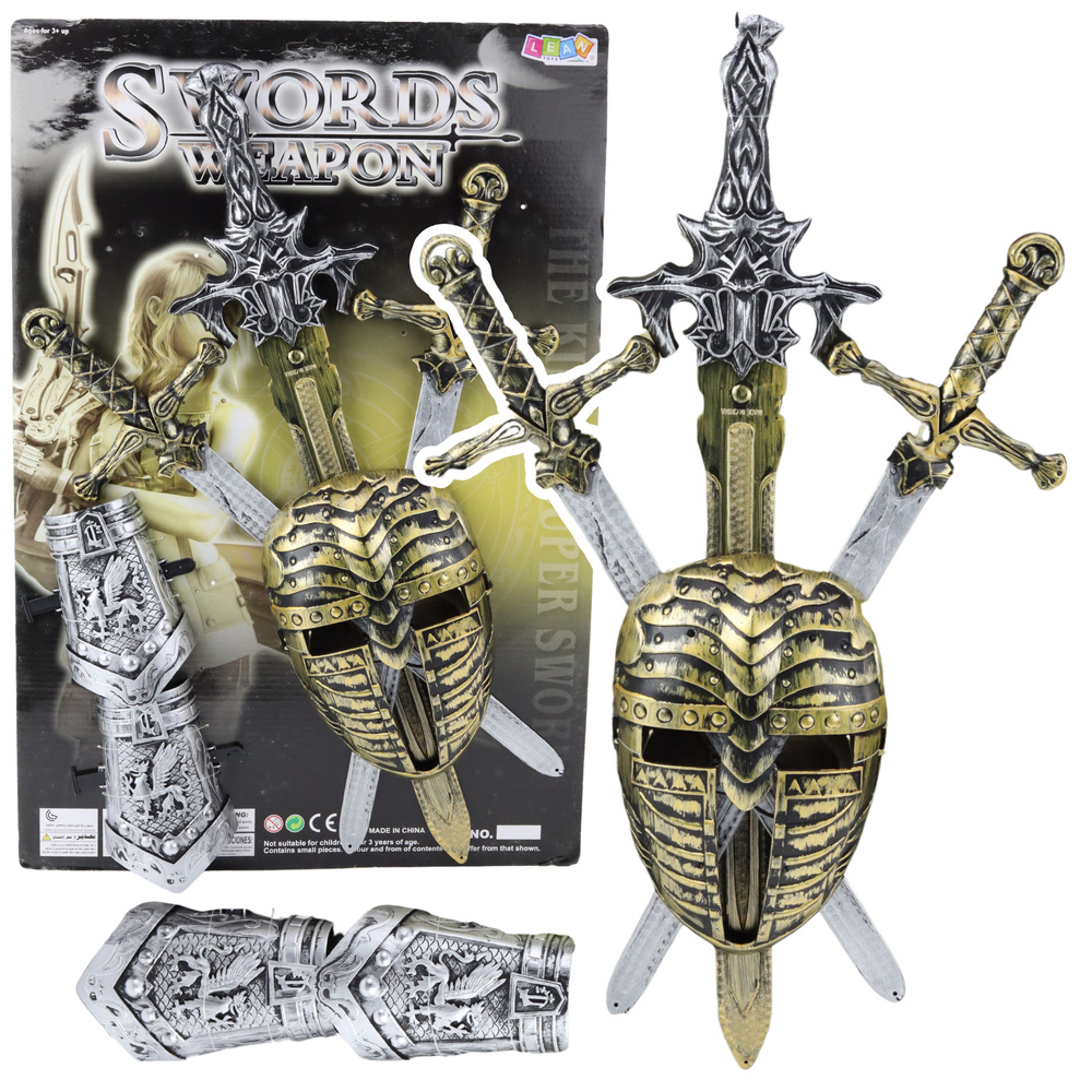 W zestawie znajdują się trzy różnej wielkości miecze, z których jeden pełni funkcję głównej broni dowódcy, a także dekoracyjna maska rycerska oraz dwa ochraniacze na ręce. Maska imituje wygląd średniowiecznego hełmu, co pozwala jeszcze lepiej wczuć się w klimat dawnych czasów i podkreśla charakter rycerskiego stroju.