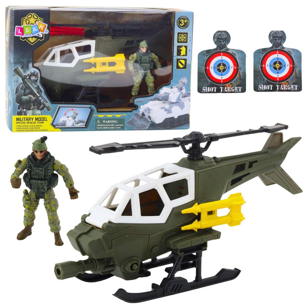 Helikopter został wyposażony w ruchome śmigła oraz elementy broni, co pozwala odgrywać różnorodne scenariusze wojskowe. W komplecie znajduje się figurka żołnierza w realistycznym umundurowaniu, którą można umieścić w kabinie helikoptera, tworząc realistyczną scenę akcji.