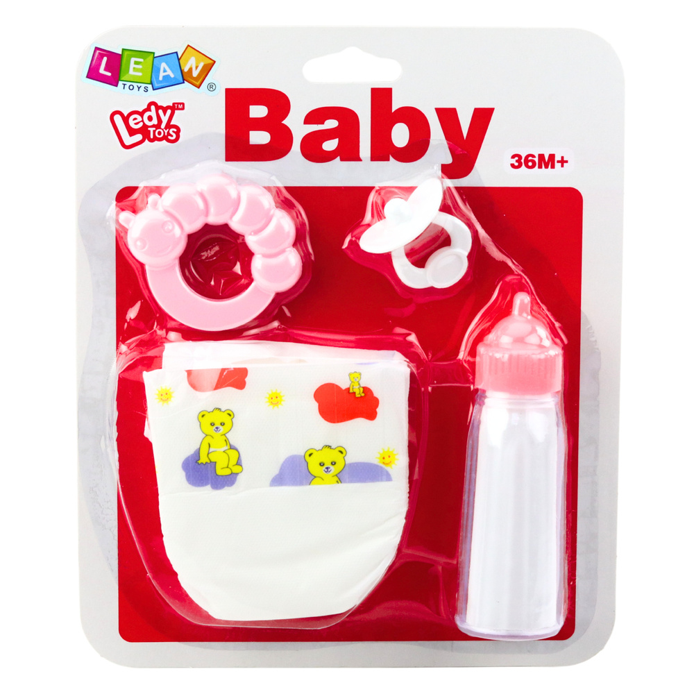 ZESTAW AKCESORIA DLA LALEK SMOCZEK BUTELKA PIELUCHA GRZECHOTKA