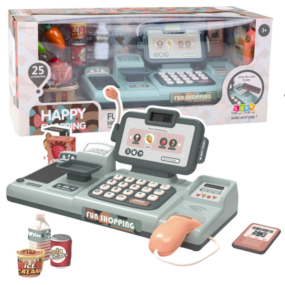 Kasa mówi po angielsku i pełni również funkcję kalkulatora – każde działanie matematyczne zostaje wypowiedziane na głos, co czyni ją ciekawym narzędziem do nauki liczb i prostych działań arytmetycznych. Mikrofon pozwala wcielić się w rolę sprzedawcy ogłaszającego promocje, a terminal umożliwia dokonywanie płatności kartą lub telefonem, jak w prawdziwym sklepie.
