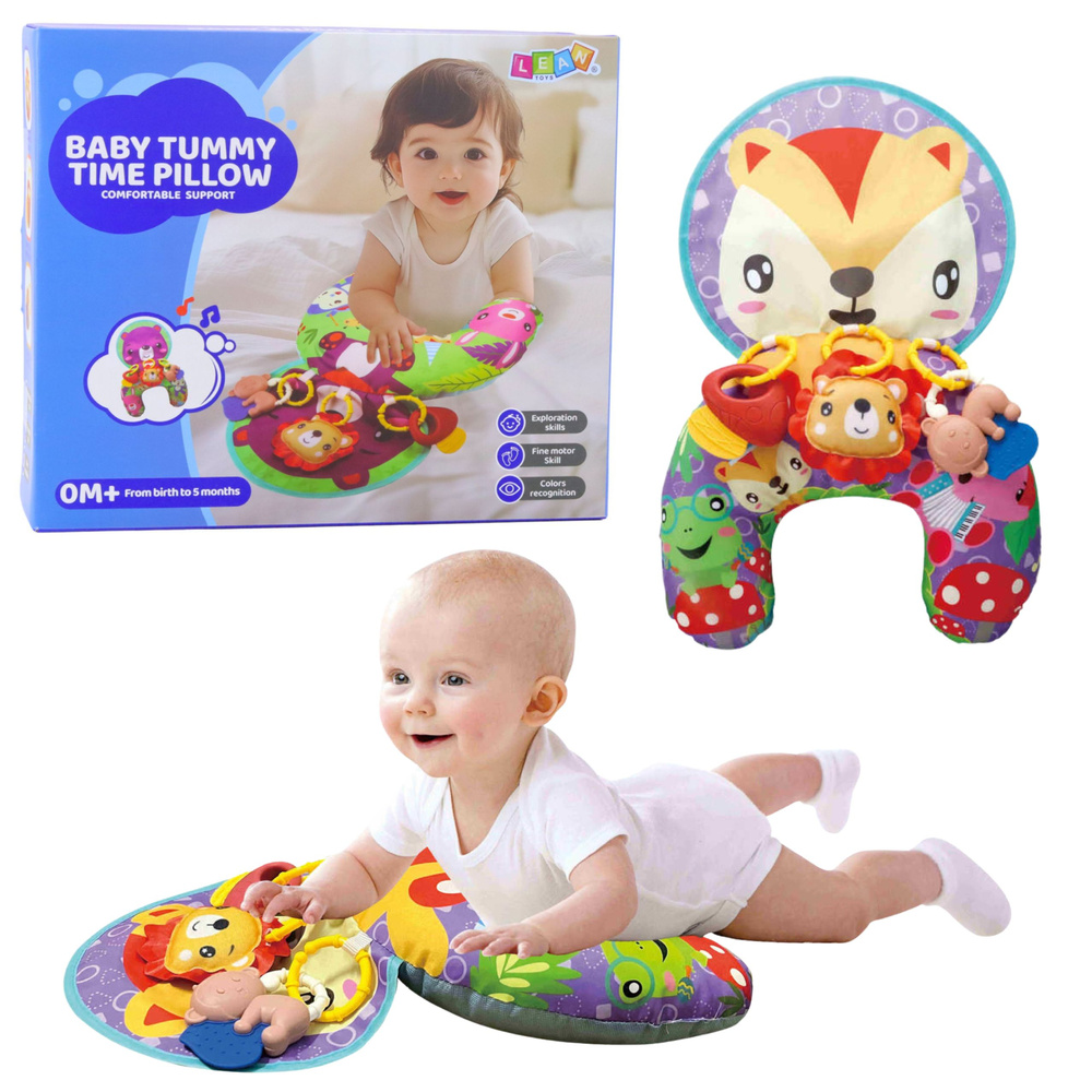 Poduszka jest kolorowa, miękka i przyjazna w dotyku, co zachęca dziecko do zabawy i eksploracji otoczenia. Do zestawu dołączono 3 zawieszki o różnych kształtach i kolorach, które można przypinać, aby pobudzały ciekawość i ćwiczyły zdolności manualne malucha. Dodatkowo mata z liskiem wykonana z szeleszczącego materiału dostarcza bodźców słuchowych, ucząc dziecko zależności przyczynowo-skutkowych – naciskanie i dotykanie wywołuje dźwięk, co wzbudza radość i zachęca do dalszej aktywności.