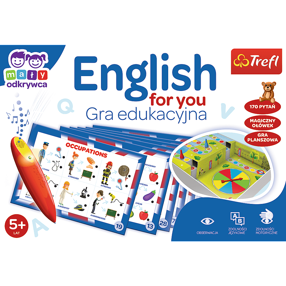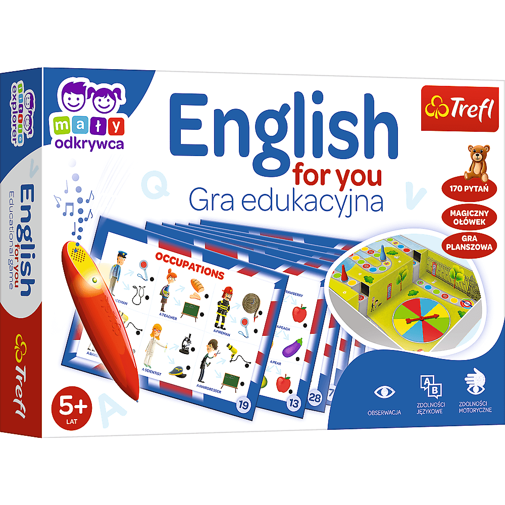 Trefl English for You – Mały Odkrywca i Magiczny Ołówek gra edukacyjna dla dzieci w wieku od 5. roku życia English for You to gra edukacyjna dla dzieci, dzięki której Mali Odkrywcy poznają podstawowe słownictwo w języku angielskim. Chwyć magiczny ołówek i ruszaj w językową podróż! Poznaj nazwy zawodów, nazwij ulubione owoce i poznaj nazwy pomieszczeń, jakie znajdują się w Twoim domu! Pięknie ilustrowane wydanie, plansza z tarczą losującą i wciągające propozycje zadań to przepis na udaną zabawę. English for You to połączenie gry planszowej i quizu. Poznasz zastosowanie angielskiego w naturalnych sytuacjach życiowych. Dołącz do gry i dogadaj się ludźmi na całym świecie! Seria Magiczny Ołówek została stworzona z myślą o jeszcze większym zaangażowaniu dzieci w proces nauki poprzez zabawę. Magiczny Ołówek wydaje sygnał dźwiękowy i świetlny, gdy na karcie z zadaniem obrazkowym zaznaczysz prawidłową odpowiedź. Cechy gry: • Gra edukacyjna, rodzinna • Nauka przez zabawę • Proste zasady • Idealna dla dzieci od 5. roku życia • Pomoc edukacyjna w przedszkolu i w klasach 1-3 Gra rozwija: • Znajomość języka angielskiego • Zdolności komunikacyjne • Spostrzegawczość oraz koordynacje wzrokowo-ruchową • Myślenie logiczne • Pamięć i koncentrację • Wyobraźnię i kreatywność Gry i zabawy językowe pomogą dzieciom stawiać pierwsze kroki w nauce języka obcego. Zestaw został przygotowany tak, by wspomagać rozwój poznawczy i intelektualny dziecka: zachęca do poznawania słownictwa i rozwija zdolności komunikacyjne w formie radosnej zabawy. English for You to idealna gra dla każdego malucha, aby rozpocząć przygodę z językiem angielskim! Poznaj Gry Trefl i podziel się radością z rozgrywki. Gry planszowe to doskonały prezent z okazji urodzin, Dnia Dziecka lub pod choinkę. Świetnie sprawdzą się podczas spotkania towarzyskiego oraz chwil spędzanych w gronie rodzinnym. Zawartość pudełka: • 32 plansze z zadaniami (16 dwustronnych kart) • magiczny ołówek • 4 pionki • instrukcja z propozycjami zabaw • planszę Wymiary pudełka: 330x227x55 Ilość Graczy: 1-4 Średni czas rozgrywki: 10-25 min Wiek: 5+