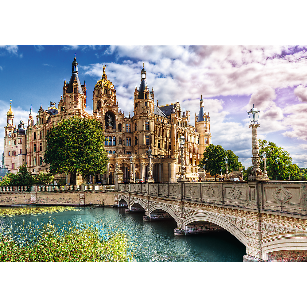 Puzzle składające się z 1000 elementów przedstawiające zamek na wyspie. Po ułożeniu powstanie obrazek o wymiarach 683x480 mm.