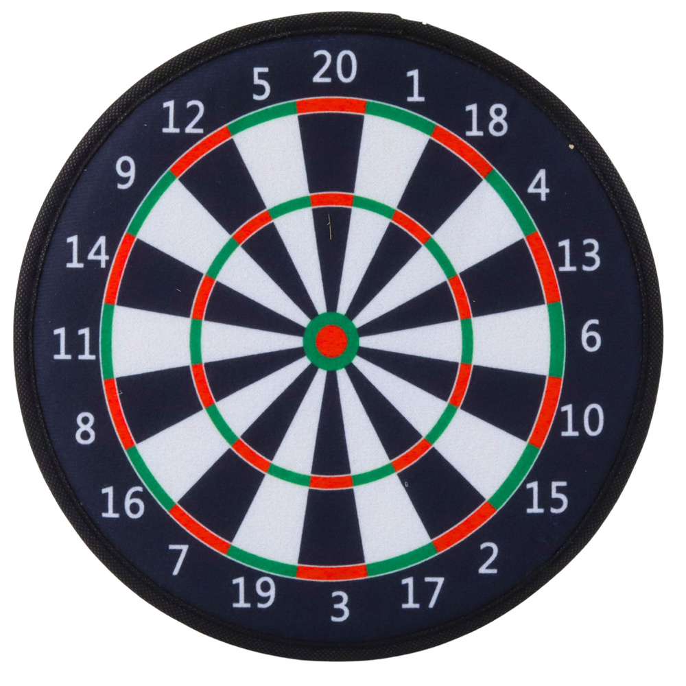 Zestaw zawiera ciemną tarczę o średnicy 28 cm, jedną strzałkę oraz jedną piłkę, obie zakończone rzepem. Tarcza posiada czytelną numerację oraz kolorystyczne strefy, które ułatwiają naukę liczenia i rozwijają refleks oraz precyzję.