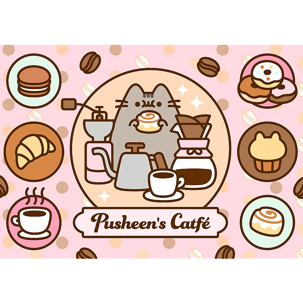 Puzzle Pusheen w kawiarni składają się z 500 elementów i przedtawiają tytułowego kota wśród kawy i słodkości. Gotowa układanka ma wymiary 480x340 mm.