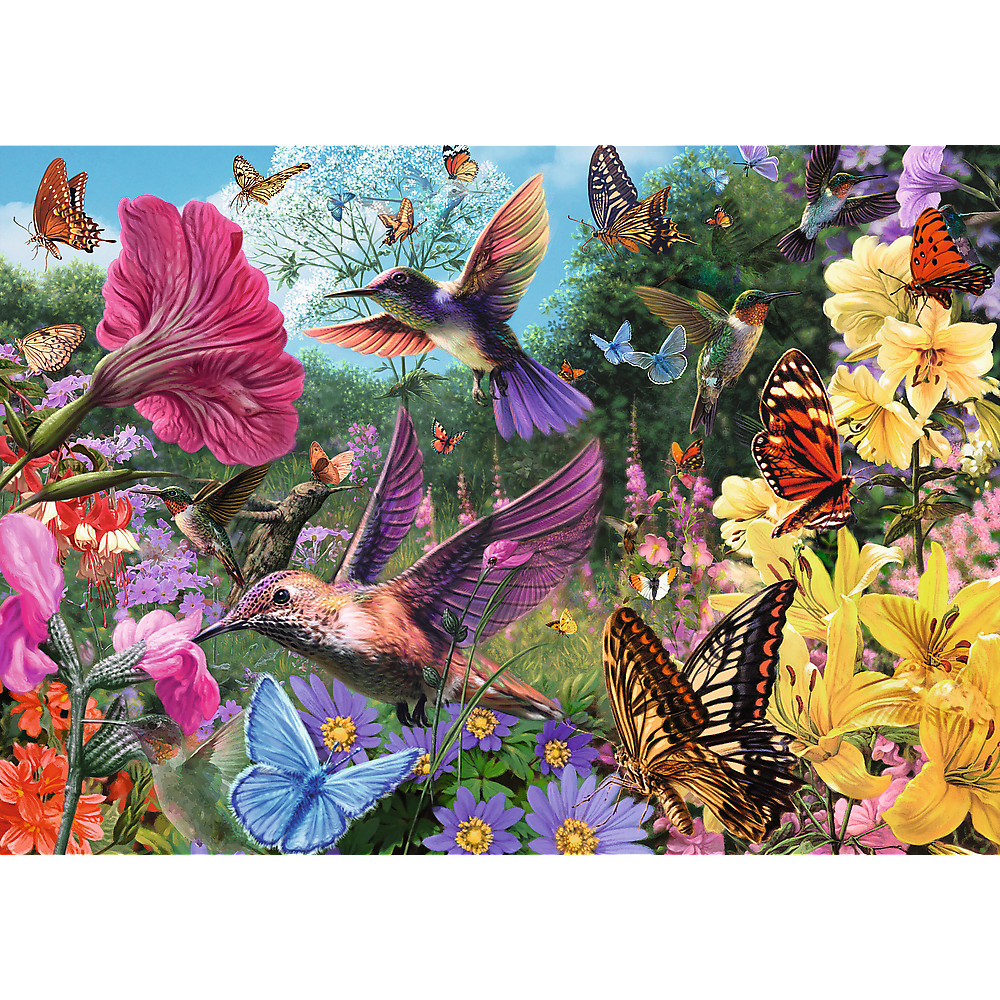 Puzzle Ogród dla ptaków przedstawiają barwną kompozycję z ptakami, kwiatami i motylami. Po ich ułożeniu powstanie obraz o wymiarach 683x480 mm.