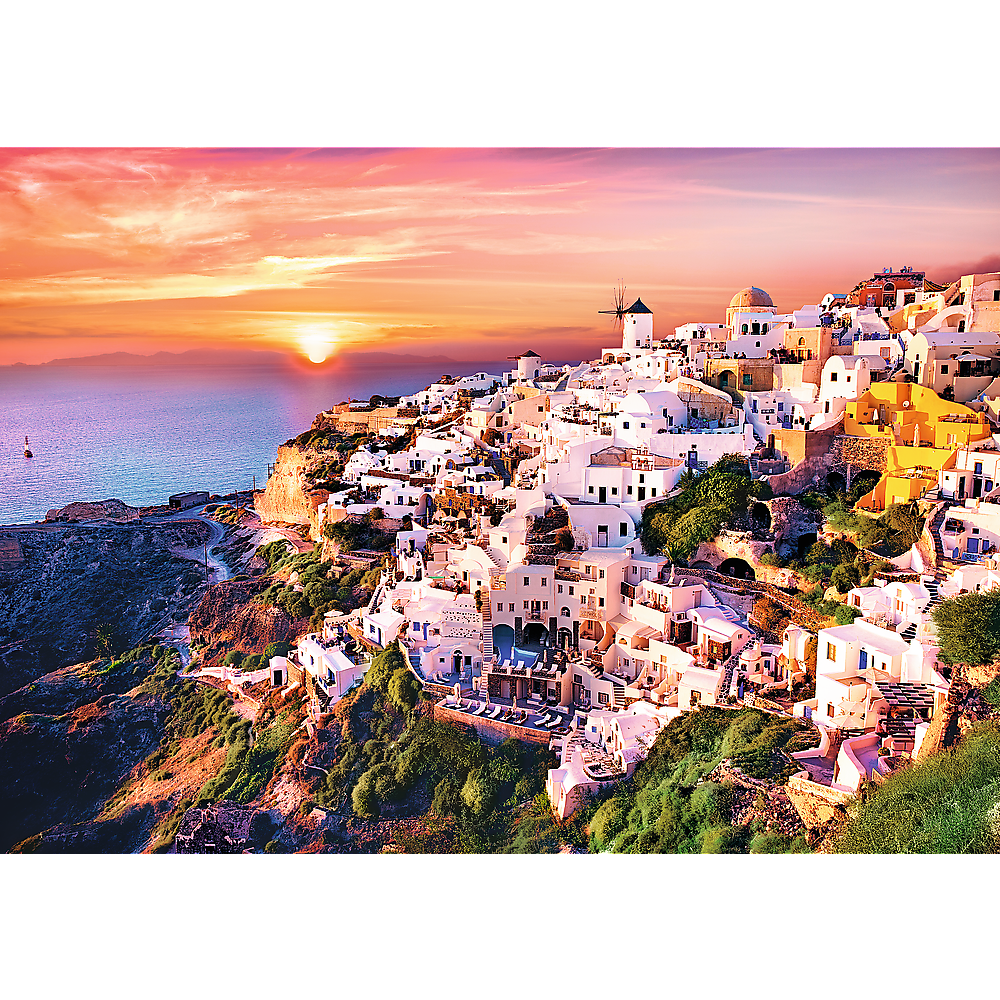 Puzzle 1000 elementów przedstawiające zachód słońca nad grecką wyspą Santorini. Po ułożeniu powstanie obrazek o wymiarach 68x48 cm. Wysoką jakość, nasycenie kolorów i bezpieczeństwo układania zapewnia kalandrowany papier odbijający światło, pokryty ekologicznymi farbami spożywczymi.