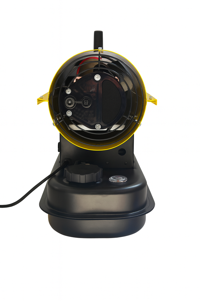Wbudowany 5-łopatkowy wentylator o wysokiej wydajności odpowiada za skuteczne wymuszanie przepływu powietrza przez urządzenie i kierowanie go w stronę wylotu nagrzewnicy, dzięki czemu ciepło jest szybko odczuwalne w ogrzewanej przestrzeni. Nagrzewnica może pracować na oleju napędowym lub lekkim oleju opałowym, a maksymalne zużycie paliwa na poziomie 0,8 l/h zapewnia korzystny stosunek wydajności do kosztów użytkowania. Zbiornik paliwa o pojemności 12 litrów pozwala na dłuższą pracę bez konieczności częstego uzupełniania, a wbudowany wziernik ułatwia kontrolę poziomu paliwa. Mobilność urządzenia zwiększają koła jezdne, dzięki którym transport i ustawienie nagrzewnicy w wybranym miejscu jest szybkie i wygodne.