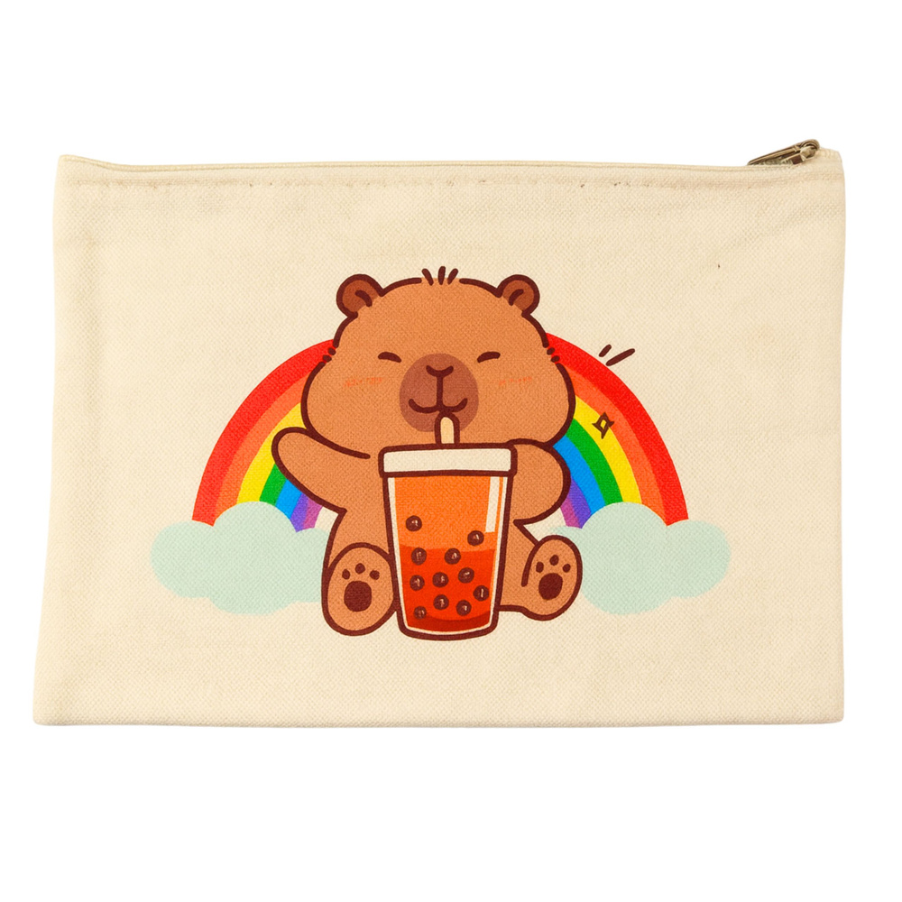 Na froncie kosmetyczki znajduje się wyjątkowa grafika przedstawiająca kapibarę pijącą bubble tea w otoczeniu tęczy i chmurek, co nadaje produktowi unikalnego uroku i wyróżnia go spośród zwykłych organizerów. Motyw ten szczególnie przypadnie do gustu dzieciom, młodzieży oraz wszystkim miłośnikom słodkich, pastelowych ilustracji.