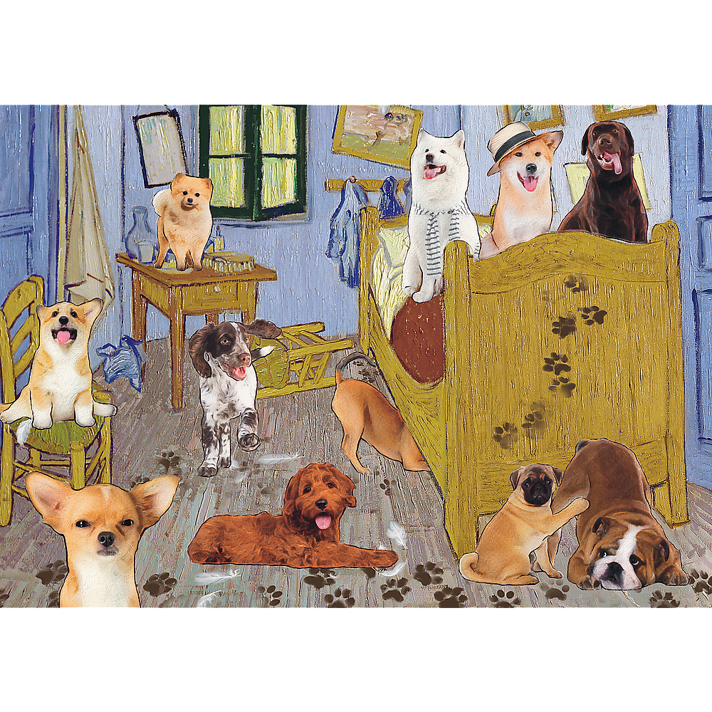 Puzzle Pokój van Gogha - Psia Rewolucja składają się z 500 elementów i przedtawiają zabawne spojrzenie na znane dzieło Pokój van Gogha w Arles, które zachwyci miłośników psów. Gotowa układanka ma wymiary 480x340 mm.