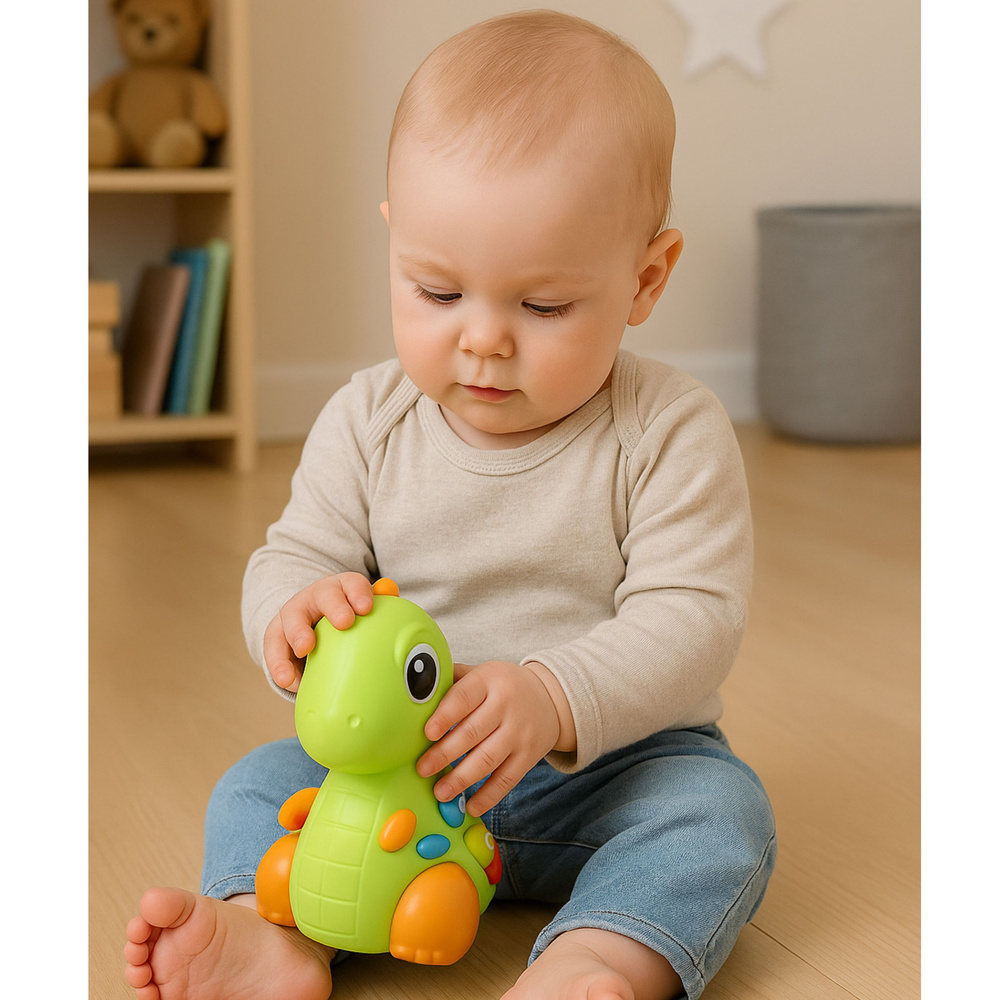 Dino ma przyciski z cyframi, które pomagają poznawać liczby, kolory i kształty. Naciśnięcie jednego z kolorowych przycisków aktywuje efekty świetlne i dźwiękowe, a delikatne stuknięcie w nosek uruchamia muzykę, zabawne odgłosy oraz ruch. Dzięki temu maluch szybko odkrywa zależność między dotykiem a reakcją zabawki, co wspiera naukę przez doświadczenie.