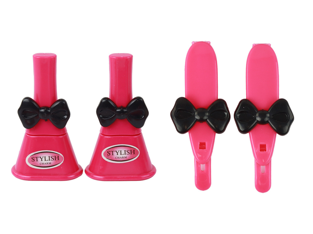 Czarno-różowy zestaw przyciągnie wzrok dziewczynek, zachęcając je do zabawy. Co ciekawego znajdą w środku? Suszarkę, która po zasileniu bateriami wydaje dźwięk przypominający prawdziwą suszarkę, a także lusterko w kształcie kwiatuszka, którego liście stanowią podpórkę. Dwie spineczki z kokardką ozdobią włoski małej damy, a mała szczotka przyda się do przeczesania włosów. Pozostałe akcesoria to między innymi opakowania przypominające cienie do powiek czy lakiery do paznokci. Zestaw ten pozwoli dziewczynce na samodzielną zabawę, a także na prowadzenie mini-salonu piękności, w który może bawić się z mamą, siostrą lub koleżankami.