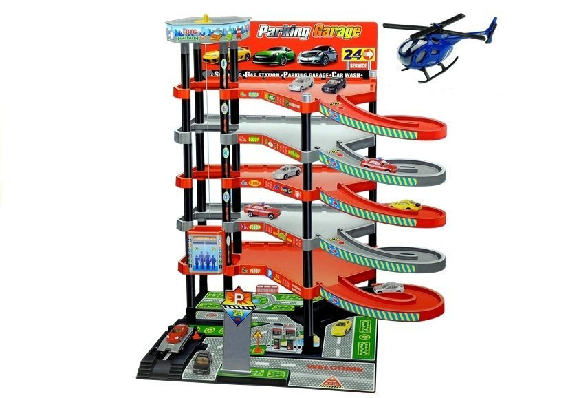 Dziecięcy zestaw motoryzacyjny składa się z wysokiej konstrukcji parkingu, a także wielu dodatkowych elementów — autek, helikoptera, naklejek służących do ozdobienia toru, znaków drogowych i pozostałych elementów infrastruktury. Pięciopiętrowy parking zbudowany jest z dużej podstawy oraz zjeżdżalni, z której mogą zjeżdżać autka, oraz manualnie obsługiwanej windy. Po umieszczeniu wybranego samochodu w windzie należy kręcić pokrętłem znajdującym się w pokrywie windy, by wprawić ją w ruch. Po dotarciu do wybranego piętra można zaparkować auto na wolnym miejscu, a do windy wjechać innym pojazdem.