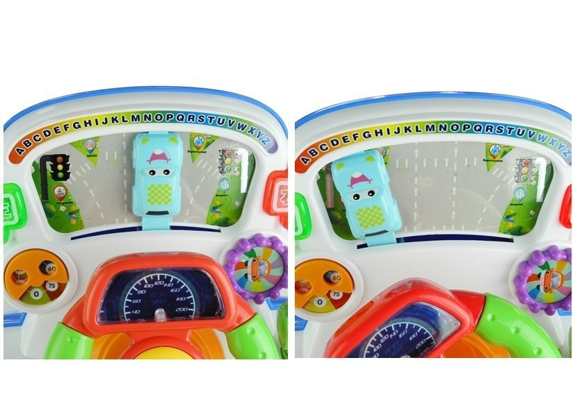 Wesołej, a przede wszystkim rozwijającej zabawie będą towarzyszyć przeróżne efekty dźwiękowe i migające, kolorowe światełka, co z pewnością sprawi, że maluch nie będzie chciał oderwać się od swojej zabawki. Podczas przekręcania kierownicy zmienia się położenie błękitnego autka, które sprawia wrażenie poruszającego się po drodze, natomiast przesunięcie pomarańczowego dysku oznaczonego prędkościami aktywuje zabawne dźwięki. To tylko jedne z wielu efektów, które zaskoczą Twojego malucha — pozostałe odkryjcie razem.
